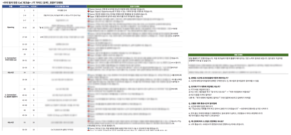 사내 FT의 첫 진행 워크숍에 전문 FT가 참관하여 쉬는시간에 사내 FT의 궁금한 점과 어려운 점을 돕고, 워크숍 후 상세 긍정 및 개선 피드백 제공